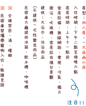 標準入住人數為4人,如須包棟,請直接電洽